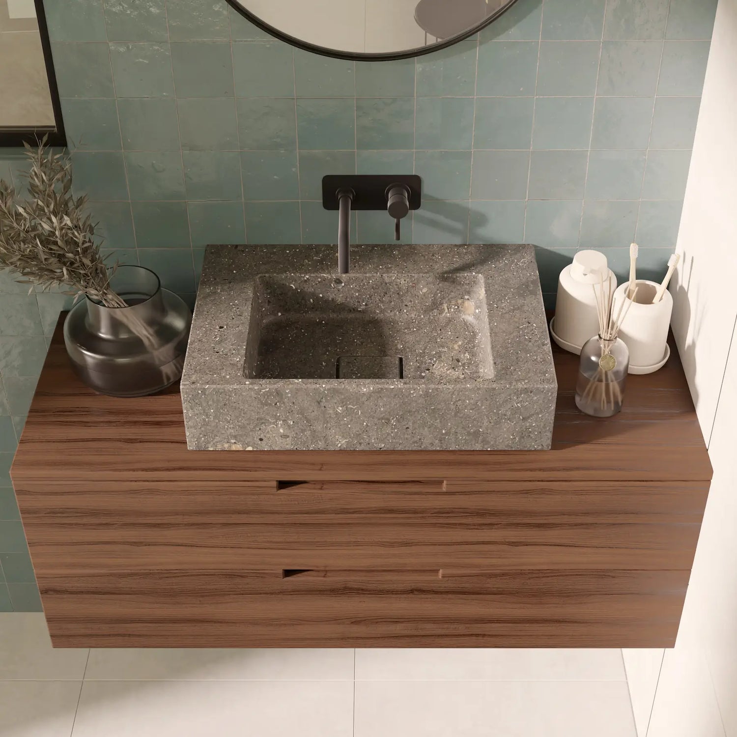 Côté meuble vasque, un meuble suspendu en teck de 115 x 45 cm, idéal pour accueillir notre modèle de vasque en pierre gris bleu de San Vicente, modèle Léman de dimensions 60 cm. Un design de vasque rectangulaire, épuré, parfaitement en harmonie avec le style général de la salle de bain.